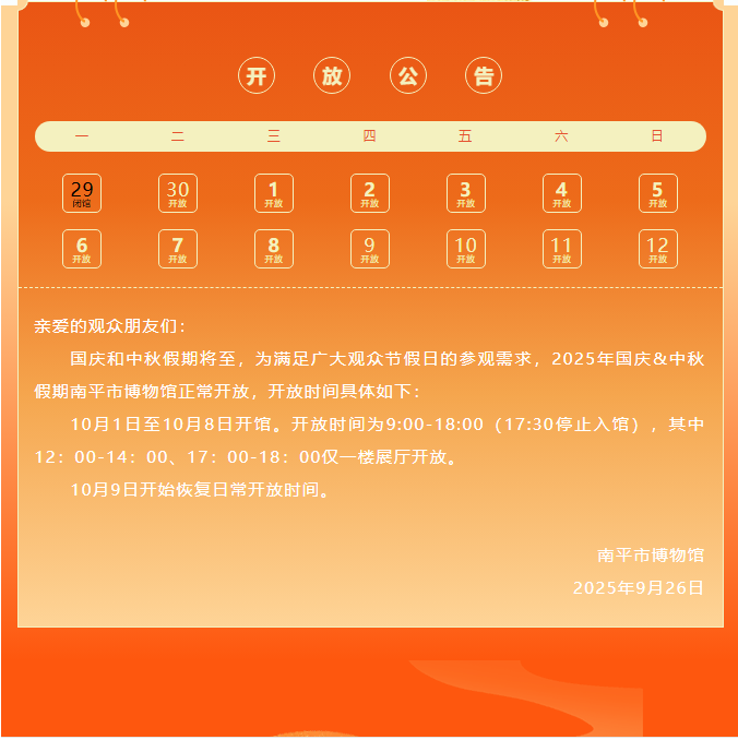【公告】南平市博物馆国庆&中秋假期开放公告!